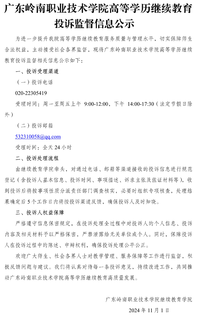 广东岭南职业技术学院高等学历继续教育投诉监督信息公示