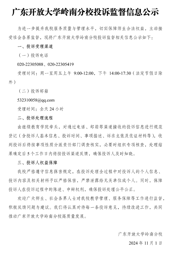 广东开放大学岭南分校投诉监督信息公示