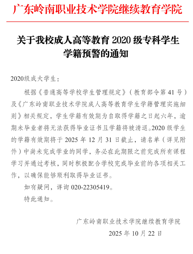 关于我校成人高等教育2020级专科学生学籍预警的通知