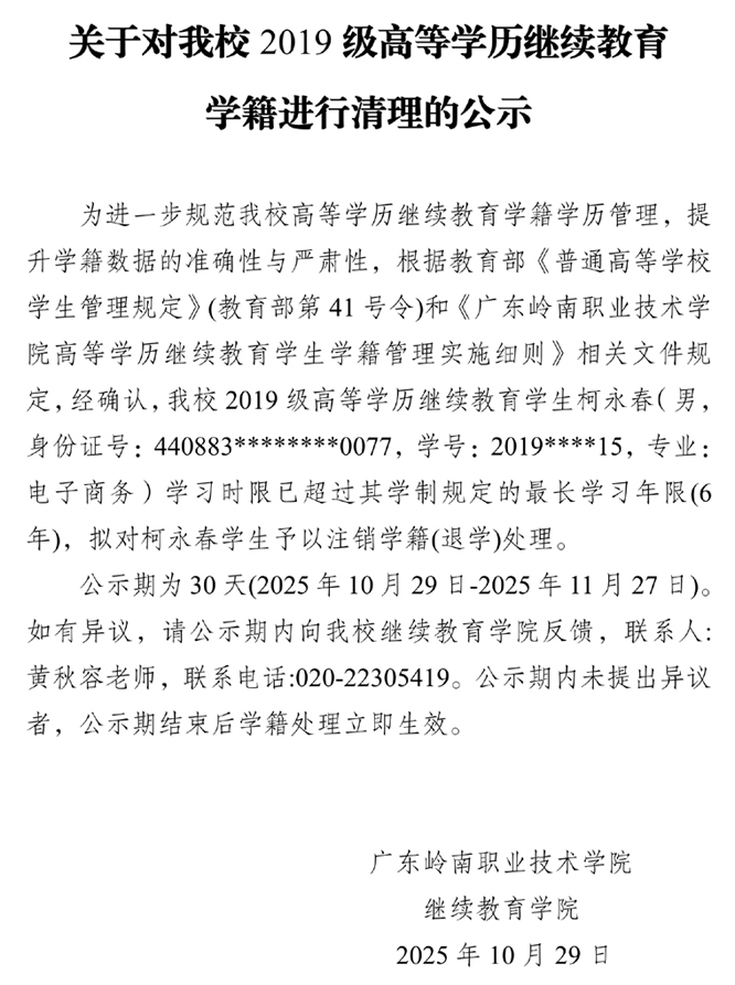 关于对我校2019级高等学历继续教育学籍进行清理的公示