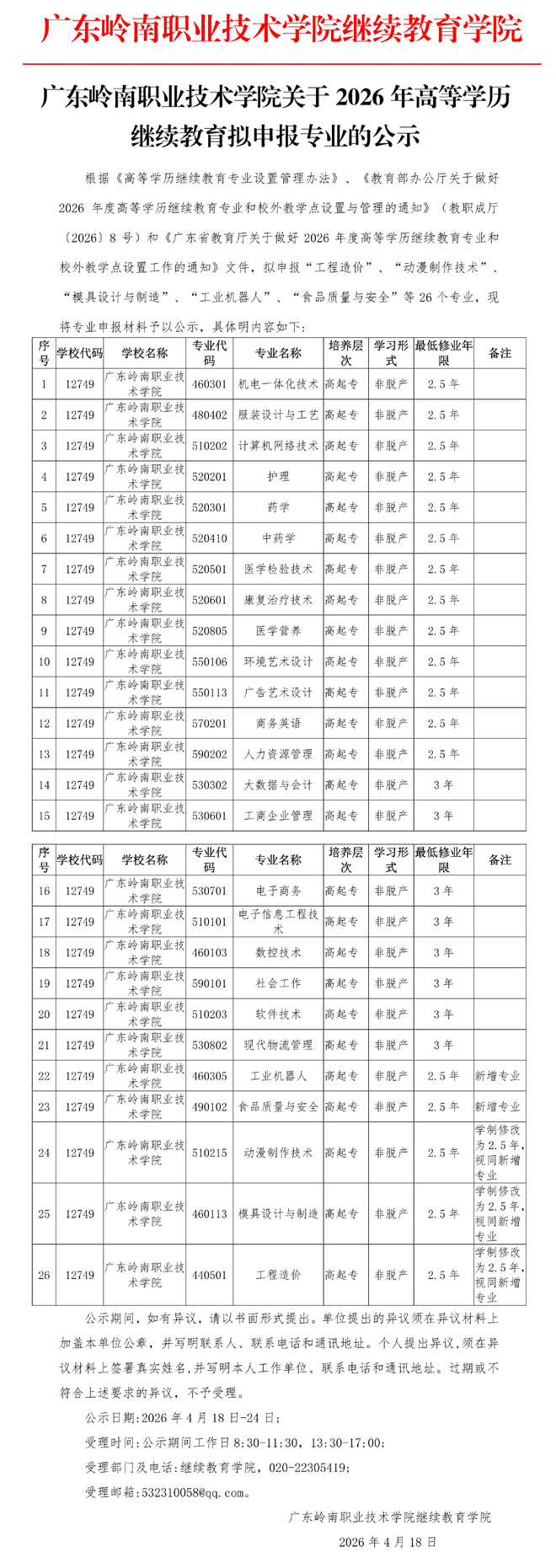 广东岭南职业技术学院关于2026年高等学历继续教育拟申报专业的公示